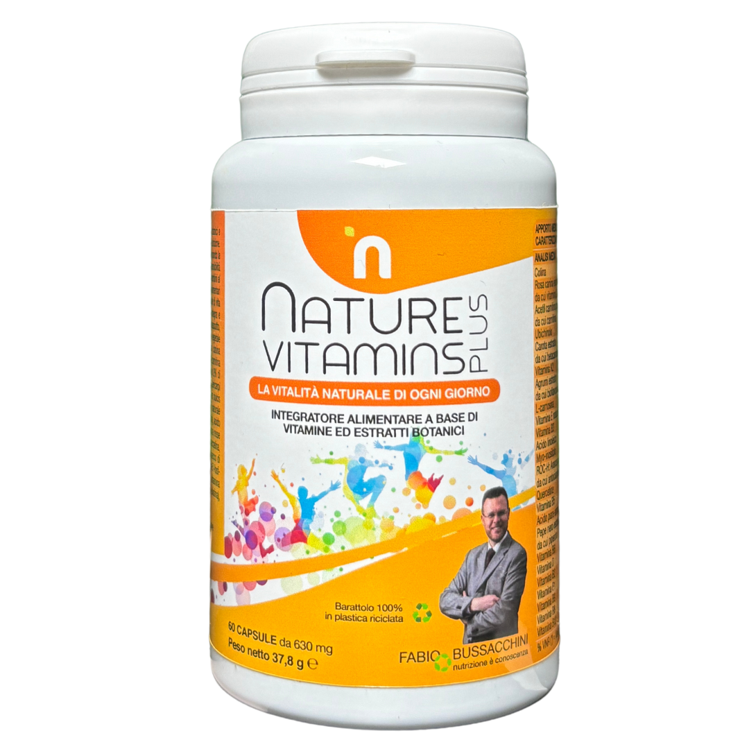 Nature Vitamins Plus è un integratore ricco di vitamine naturali, biodisponibili, perfetto per sostenere il sistema immunitario durante tutto l'anno. Si presenta in capsule vegetali certificate come disaggreganti, facili da deglutire, che vanno assunte a stomaco pieno con un bicchiere d'acqua. Ogni barattolo contiene 60 capsule, sufficienti quindi per due mesi di assunzione quotidiana e continuativa.